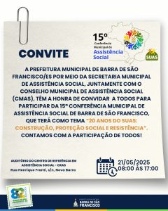 A Prefeitura convida todos os cidadãos a participarem ativamente do encontro, contribuindo com ideias, reflexões e propostas que possam fortalecer a rede de proteção social em Barra de São Francisco.
