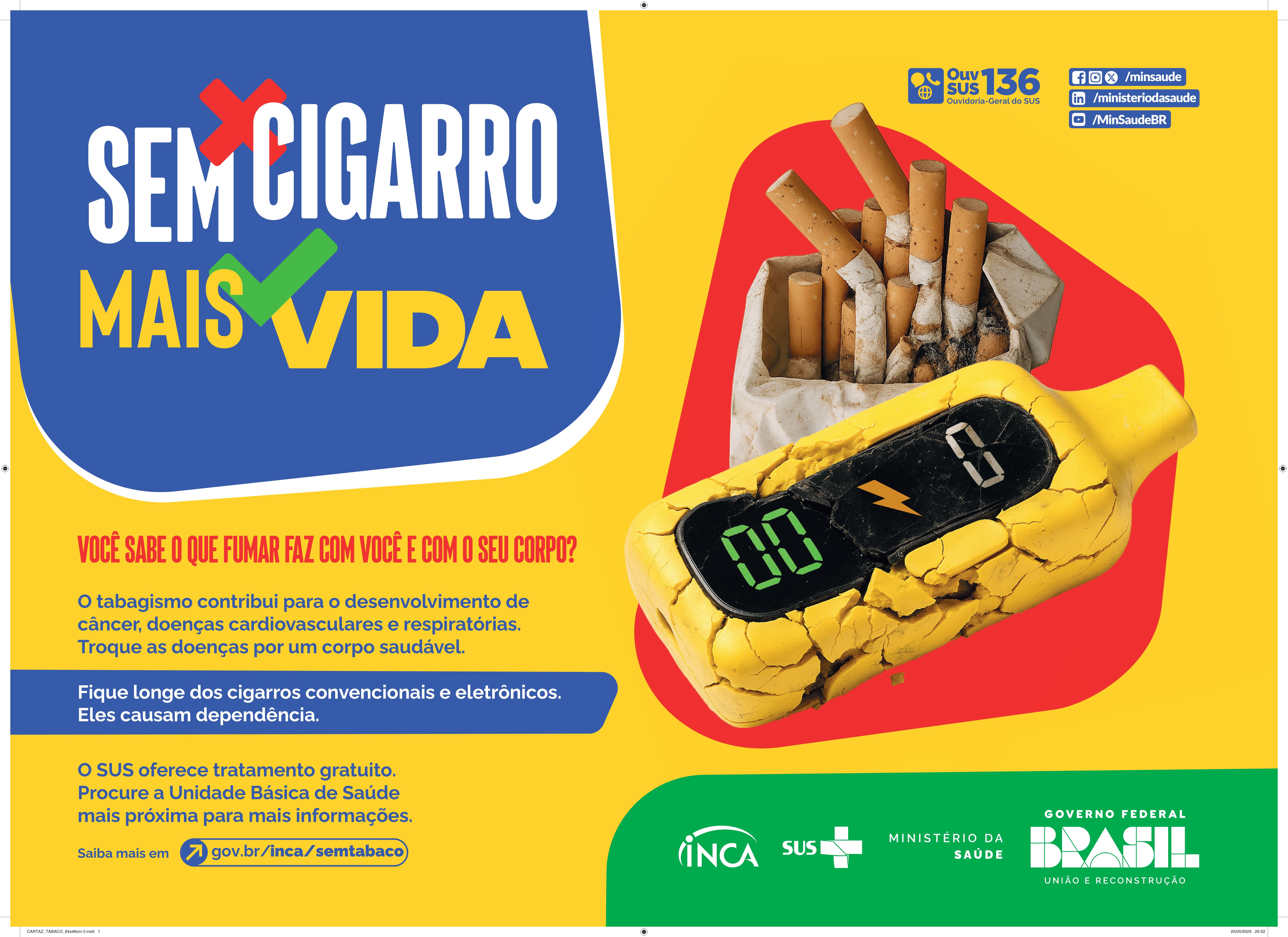 O Ministério da Saúde, por meio do Inca, atua na gestão e governança do controle do tabagismo no Brasil, sob a ótica da promoção da saúde, desde o final da década de 1980. Na imagem, a campanha lançada pelo MS nesta 4ª feira (28.mai)
