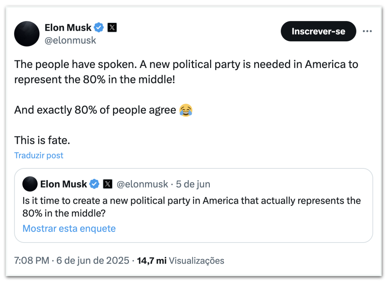 Na 5ª feira (5.jun), Musk fez uma enquete em seu perfil no X (ex-Twitter) questionando os usuários se eles achavam que era necessária a criação de um novo grupo político no país.