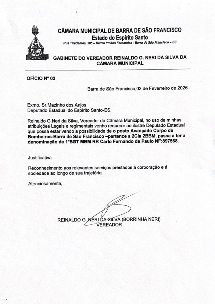 O vereador Borrinha Neri encaminhará um ofício ao Deputado Estadual Mazinho dos Anjos solicitando que o Posto Avançado do Corpo de Bombeiros de Barra de São Francisco, vinculado à 2ª Companhia do 2º Batalhão de Bombeiros Militar (2º BBM), receba oficialmente a denominação de 1º Sargento MBM RR Carlos Fernando de Paulo.